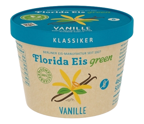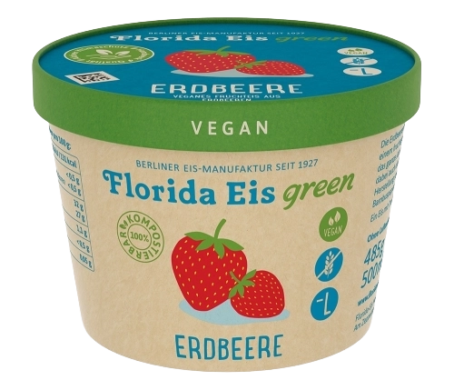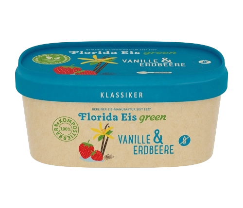 Vanille-Milcheis mit echter Bourbon-Vanille kombiniert mit veganem Fruchteis aus frischen Erdbeeren