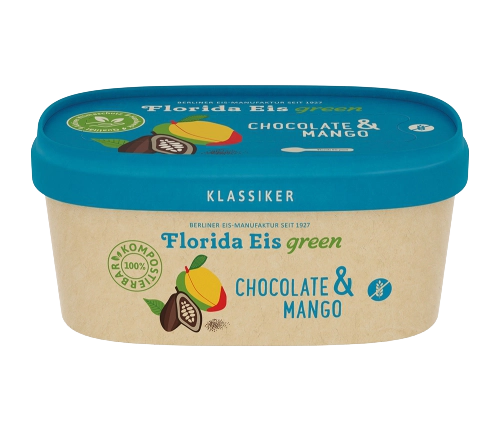 Cremig feines Schokoladenmilcheis kombiniert mit veganem Fruchteis aus saftigen Mangos